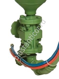 Дозировочные клапаны стандартного изготовления имеют прямой проток для материала. Проведенные опыты доказали, что такие клапаны имеют склонность к нарушению бесперебойной подачи материала. Поток материала или прерывается, или полностью прекращается, в том случае, если давление в резервуаре и в воздухопроводе не сбалансировано. Этого удается избежать благодаря эксцентрической системе протока материала в дозировочном клапане.