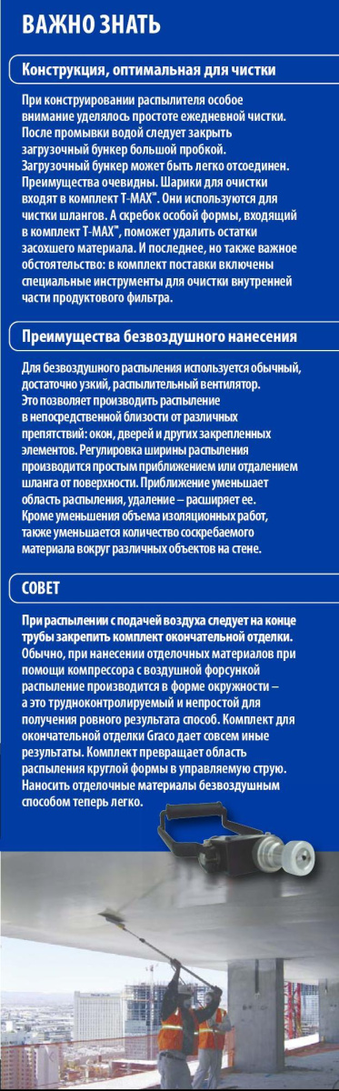 Т-МАХ - это не просто установка, а комплексное решение для нанесения штукатурки. Конструкция распылителя позволяет его использование одним маляром, при это она легкая в переносе, использовании и чистке. Т-МАХ был проверен и одобрен для нанесения большинства предлагаемых на рынке типов штукатурки, как смешанной, так и предварительно смешанной.