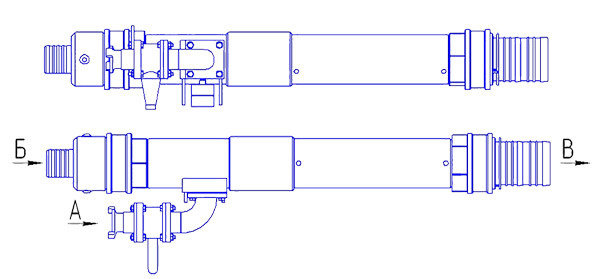 Воздух от компрессора подаётся в линию А. Проходя через воздушное сопло поток воздуха в камере смешения создаёт разряжение. За счёт разряжения в камере смешения, происходит всасывание воздуха и собираемого материала в линии Б. После камеры смешения смесь воздуха и транспортируемого материала поступает в сопло Вентури, где она разгоняется и передаётся в линию нагнетания В. Давление поступающего воздуха и разряжение, создаваемое в камере смешения контролируются манометром и вакуумметром.